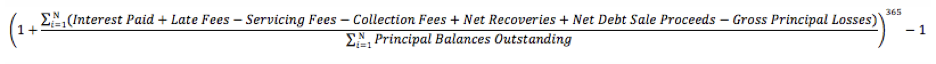 For each Group, we calculate: (a) the sum of the Interest Paid, plus Late Fees, minus Servicing Fees, minus Collection Fees, in each case on active loans2, plus Net Recoveries on charged-off or defaulted loans, plus Net Debt Sale Proceeds on sold loans, minus Gross Principal Losses; divided by (b) the sum of the Principal Balances Outstanding on active loans2 at the end of each day since origination.1 We then annualize the result to get the “Historical Return” for the Group.*