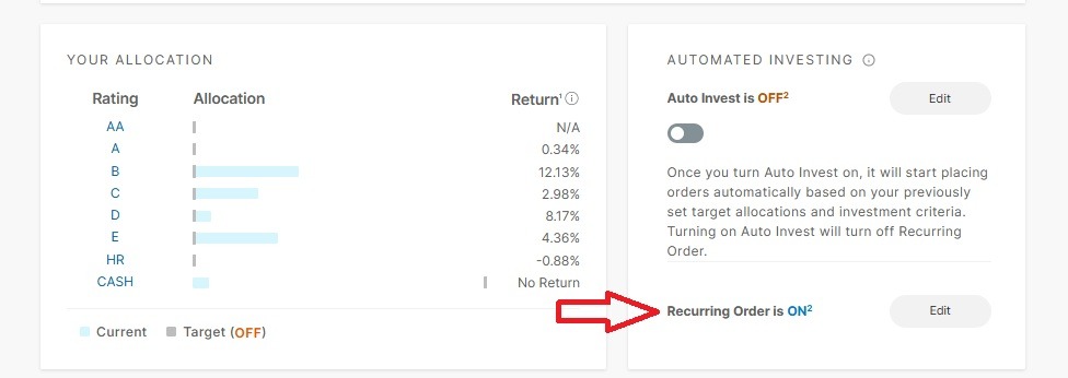 - Near the bottom of the page in the “Automated Investing” section, select “Edit” located next to “Recurring Order is ON.”