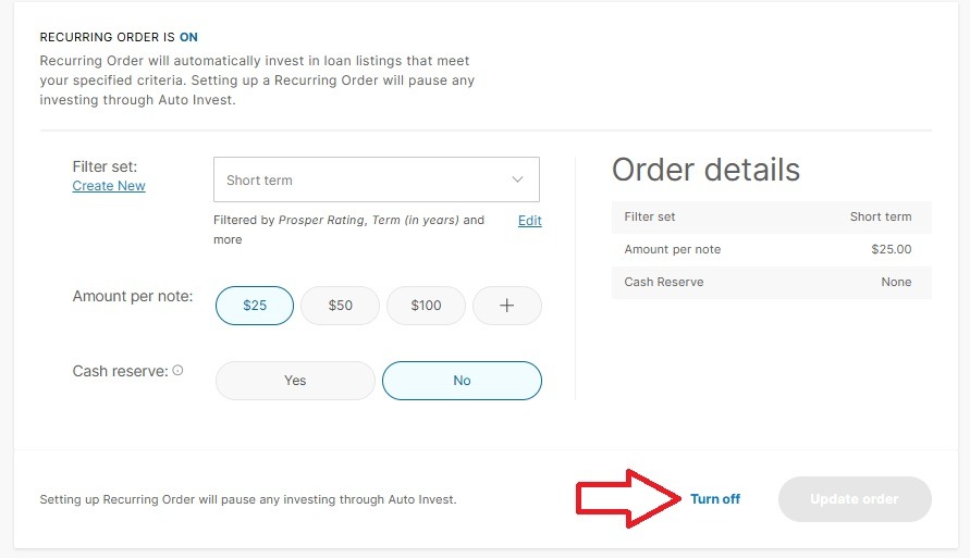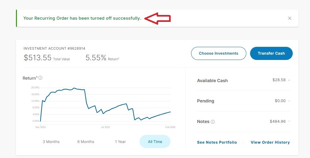 Once you are redirected to your Investor My Account page, you will see a banner confirming that your Recurring Order has been turned off successfully.